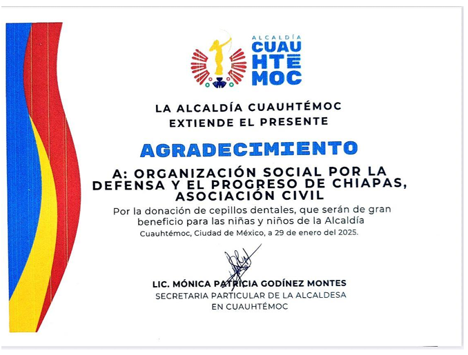 El 19 de octubre del 2000 se constituye la Organización Social por la Defensa y el Progreso de Chiapas Asociación Civil, en el estado de Chiapas, con un enfoque de género, respeto y unión, para fortalecer la integración familiar, la salud, la educación, el desarrollo económico y social de la población más vulnerable, principios que han sido fundamentales durante 24 años de trayectoria. Se realizan acciones de gestoría a favor de la sociedad, Desarrollo de capacidades, defensa de los derechos humanos, equidad de género, se trabaja en un plan de desarrollo integral de salud y desarrollo sustentable, en las localidades más carentes de servicios como de medicina familiar, psicología, odontología, nutrición, activación deportiva con jóvenes y adultos.